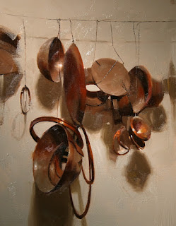 I have been composing a piece of visual music on this canvas. So I name this painting "Spatial Melody". You might be curious what are those tinker thingies and why they are hanging there. I did not arrange this set of still lives myself. I painted this from a photo I took in September when I visited a cloisonné factory in Beijing. The workers hang their parts on the the wall semi randomly. They form beautiful patterns naturally without too much human intentions. I snapped a few images and know I will paint them some day. To be honest with you, I am not a very creative person. I tend to "discover" things rather than "inventing". In other words, I consider the world is all ready perfect. There is no need to create "better" stuff. We only need to do is to remove our ignorance and see better.