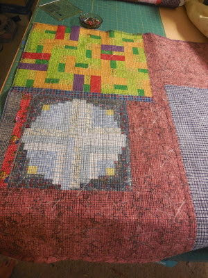 Perhaps you noticed when I showed pictures of my second flag quilt earlier this week that the back of the piece is quite a mishmash. I'm deliberately using up leftovers in all phases of my flag quilts -- leftover chunks of batting, leftover and recycled fabrics for the quilt tops, and miscellaneous fabrics for backing. Since I'm constructing the quilt in modules, it's easy to find some poor misbegotten piece of fabric the right size, or augment it, to back a small module. Sometimes I'm using pieced work that never made it to prime time as backing.